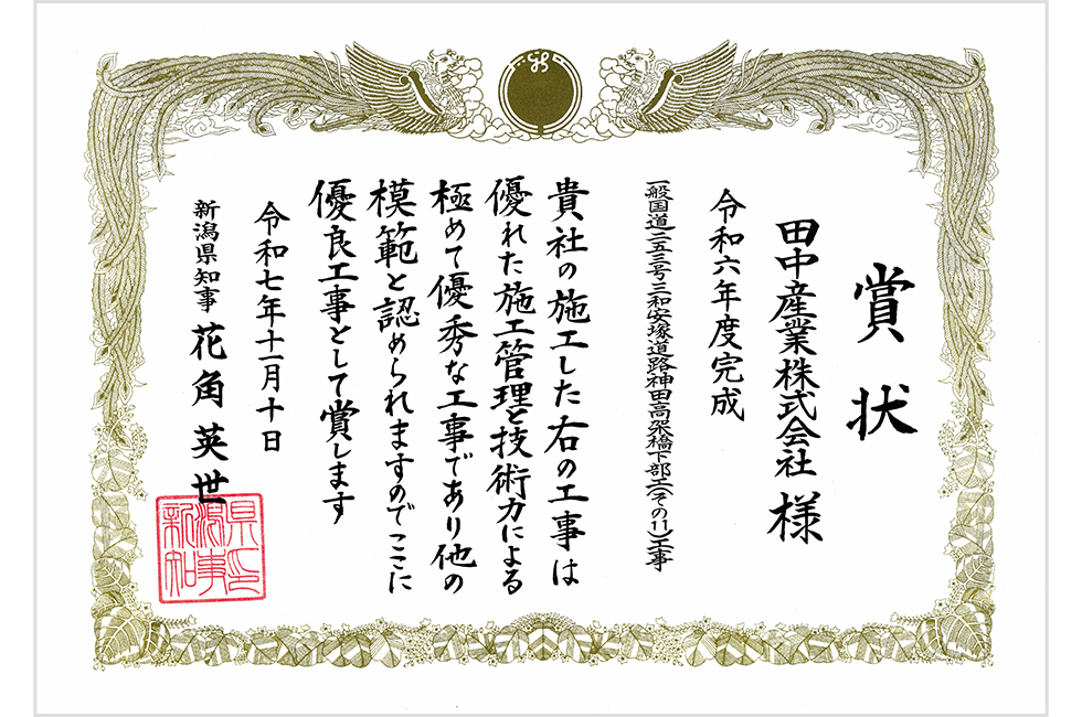 新潟県知事 花角英世様より優良工事表彰をいただきました。
